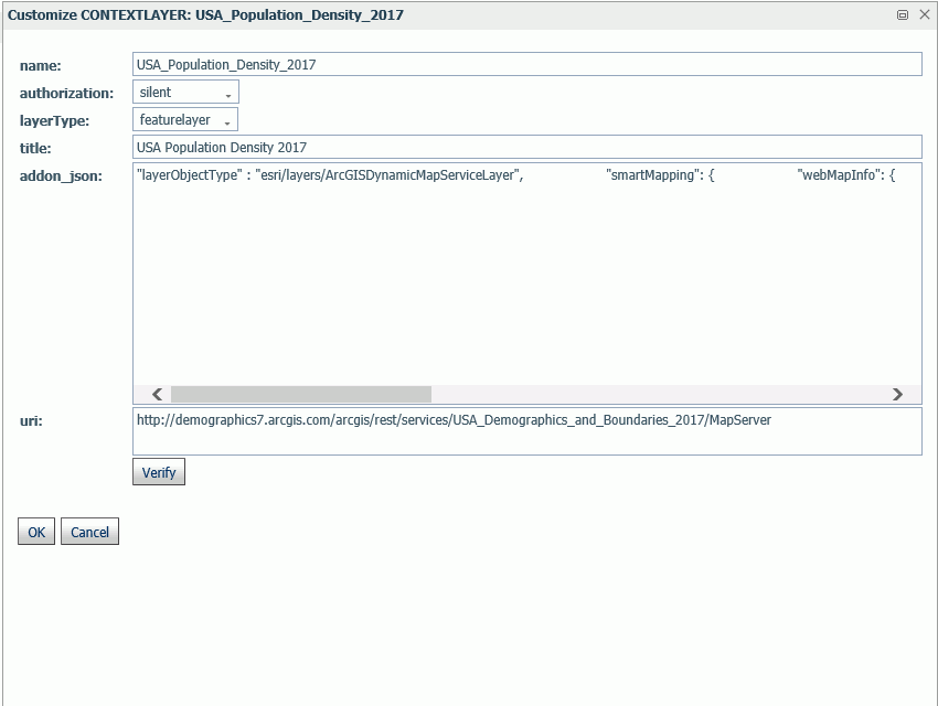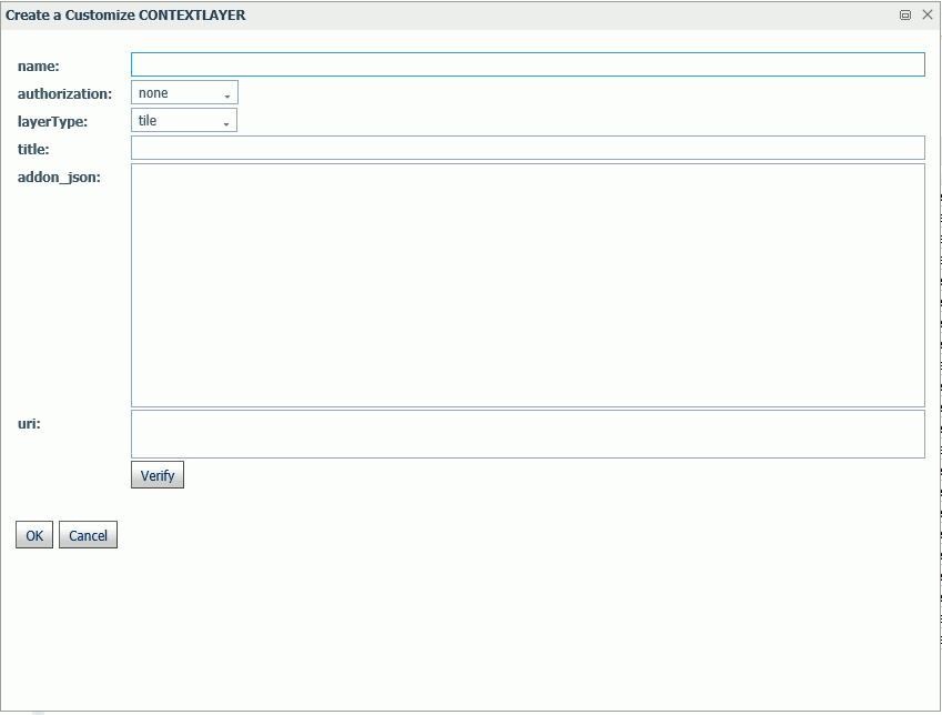 Enter a name for the context layer, the authorization type, a layer type, a title to display, any additional JSON needed for rendering the context layer, and the URI to the map service that provides the context layer, and click Verify.