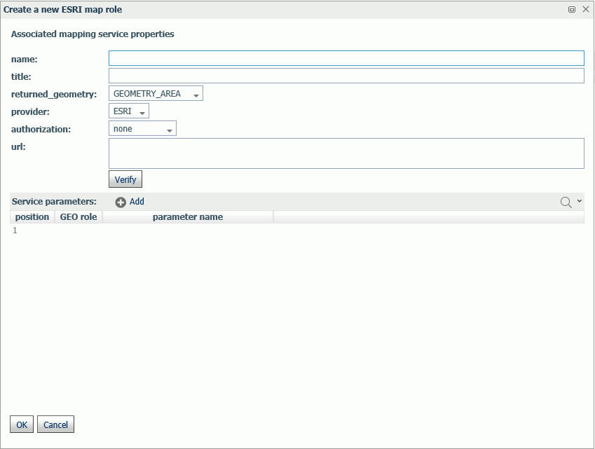 To add an Esri geographic role, click Add ESRI map on the Geographic Configuration Editor.