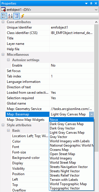 After clicking OK, then Save, the custom vector basemap becomes available for selection in the WebFOCUS App Studio Properties panel for the Esri map component, as shown in the following image.
