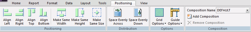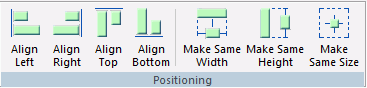 The Positioning group contains commands to align the objects on the Precision Report canvas, as shown in the following image.