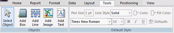 The Tools tab contains the Objects and Default Style groups, as shown in the following image.
