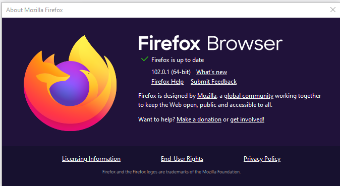 An example of the About Firefox Browser dialog box is shown in the following image.