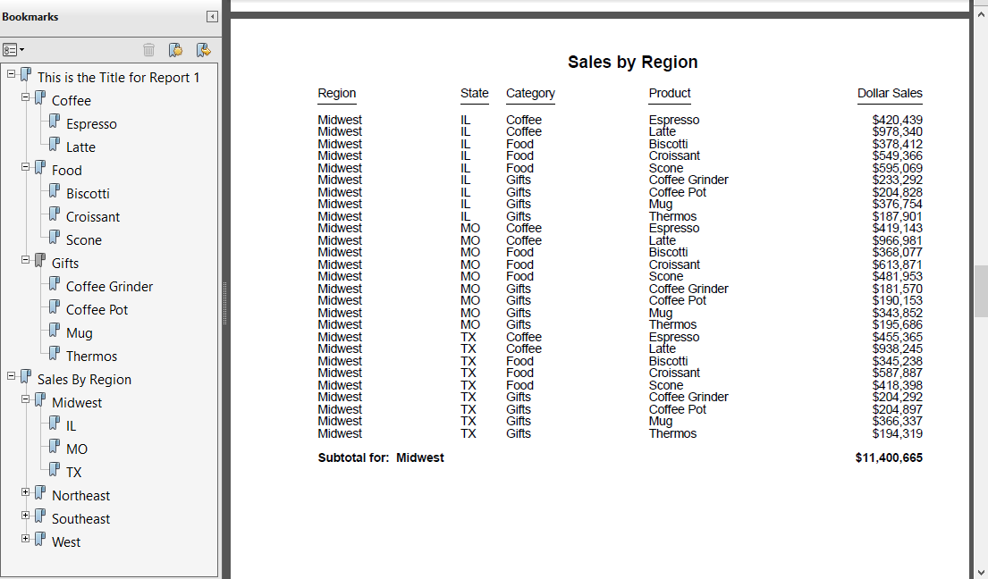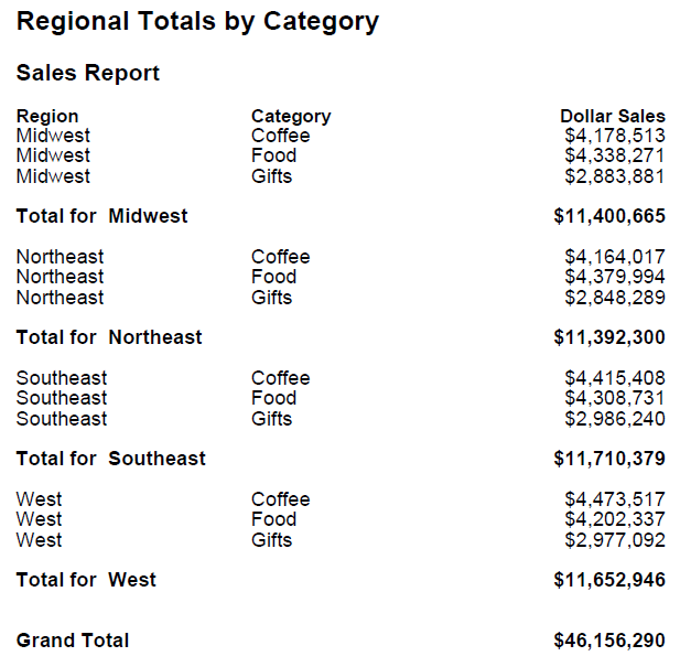 TABLE FILE GGSALES SUM DOLLARS/D12M BY REGION BY CATEGORY ON REGION SUBTOTAL AS 'Total for ' HEADING " " "Sales Report" " " ON TABLE SET ACCESSPDF 508 ON TABLE SET PAGE-NUM OFF ON TABLE COLUMN-TOTAL AS 'Grand Total' ON TABLE SUBHEAD "Regional Totals by Category" ON TABLE PCHOLD FORMAT PDF ON TABLE SET STYLE * TYPE=REPORT, FONT='ARIAL',$ TYPE=TITLE, COLUMN=N1, FONT='ARIAL', STYLE=BOLD,$ TYPE=TITLE, COLUMN=N2, FONT='ARIAL', STYLE=BOLD,$ TYPE=TITLE, COLUMN=N3, FONT='ARIAL', STYLE=BOLD,$ TYPE=HEADING, SIZE=14, STYLE=BOLD,$ TYPE=TABHEADING, SIZE=16, STYLE=BOLD,$ TYPE=SUBTOTAL, BY=1, STYLE=BOLD,$ TYPE=GRANDTOTAL, FONT='ARIAL', STYLE=BOLD,$ ENDSTYLE END