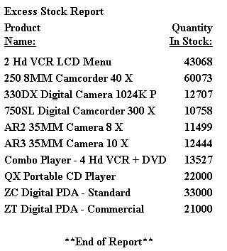 TABLE FILE CENTINV HEADING "Excess Stock Report" SUM QTY_IN_STOCK BY PRODNAME WHERE QTY_IN_STOCK GT 10000 FOOTING CENTER "**End of Report**" ON TABLE SET PAGE-NUM OFF ON TABLE SET STYLE * TYPE=REPORT, GRID=OFF,$ TYPE=REPORT, COLUMN=N1, STYLE=ITALIC,$ ENDSTYLE END