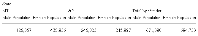 TABLE FILE GGDEMOG PRINT MALEPOP98 FEMPOP98 ROW-TOTAL/D12 AS 'Total Population by State' BY ST WHERE (ST EQ 'WY' OR 'MT') ON TABLE COLUMN-TOTAL AS 'Total Population by Gender' ON TABLE SET PAGE-NUM OFF ON TABLE SET ONLINE-FMT HTML ON TABLE SET STYLESHEET * TYPE=REPORT, GRID=OFF, $ ENDSTYLE END