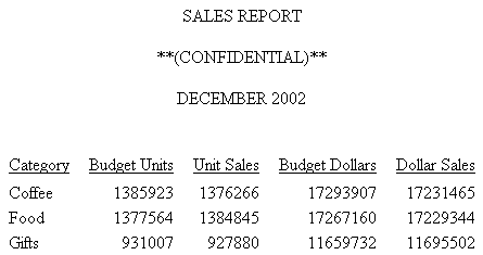 TABLE FILE GGSALES SUM BUDUNITS UNITS BUDDOLLARS DOLLARS BY CATEGORY ON TABLE SUBHEAD "SALES REPORT" " " "**(CONFIDENTIAL)**</1" "December 2002 </2" ON TABLE SET PAGE-NUM OFF ON TABLE SET ONLINE-FMT HTML ON TABLE SET HTMLCSS ON ON TABLE SET STYLESHEET * TYPE=REPORT, GRID=OFF, TOPMARGIN=0, $ TYPE = TABHEADING, JUSTIFY = CENTER, $ ENDSTYLE END