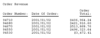 TABLE FILE CENTORD HEADING "Order Revenue" " " SUM ORDER_DATE LINEPRICE AS 'Order,Total:' BY HIGHEST 5 ORDER_NUM ON TABLE PAGE-BREAK AND SUBFOOT "END OF REPORT" ON TABLE SET PAGE-NUM OFF ON TABLE SET ONLINE-FMT PDF END