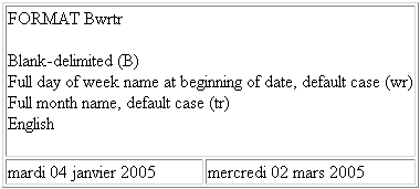 DATETRAN (DATE, '(YYMD)', '(.t)', 'FR', 40, 'A40'); The following request prints the day of the week in the default case of the specific language: