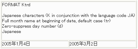 TABLE FILE VIDEOTRK HEADING "FORMAT Ktrd" "" "Japanese characters (K in conjunction with the language code JA)" "Full month name at beginning of date, default case (tr)" "Zero-suppress day number (d)" "Japanese" "" SUM OUT6A AS '' OUT6B AS '' TRANSDATE NOPRINT ON TABLE SET PAGE-NUM OFF END