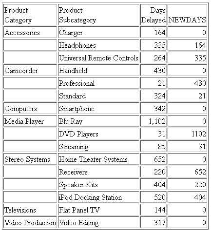 TABLE FILE WF_RETAIL_LITE SUM DAYSDELAYED COMPUTE NEWDAYS/I5=PARTITION_REF(DAYSDELAYED, PRODUCT_CATEGORY, -1); BY PRODUCT_CATEGORY BY PRODUCT_SUBCATEG ON TABLE SET PAGE NOPAGE END