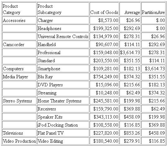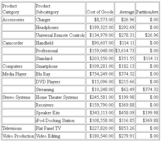 TABLE FILE WF_RETAIL_LITE SUM COGS_US AVE.COGS_US AS Average COMPUTE PartitionAve/D12.2M=PARTITION_REF(AVE.COGS_US, PRODUCT_CATEGORY, -2); BY PRODUCT_CATEGORY BY PRODUCT_SUBCATEG ON TABLE SET PAGE NOPAGE END