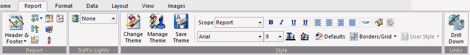 You use the Report tab to modify report properties, change the style of rows and columns on your report, or create filters. The Report tab contains the following groups: Filter, Report, Traffic Lights, Style, and Links. The Report tab is located at the top of the trademark and rebranding WebFOCUS App Studio interface and is available only when you are creating or working with a report. The Report tab is shown in the following image.