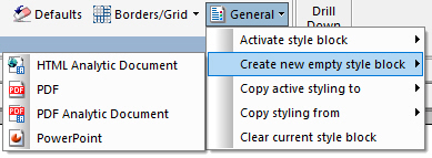 You can create, calculate, and present financially oriented data such as balance sheets, consolidations, profit and loss statements, budgets, and certain government mandated reports. These reports are distinguished from other WebFOCUS reports because calculations are inter-row as well as inter-column. Each row or line represents a unique entry or series of entries that can be aggregated directly from the input data, or calculated as some function of the data. The Matrix tab is located at the top of the WebFOCUS App Studio interface and is only accessible when a FOR field is selected on the Report canvas and the Matrix tab is selected from the bottom of the Report canvas. The Matrix tab is shown in the following image.