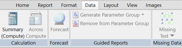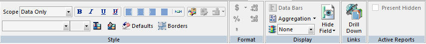 You use the options on the Report tab, in the Report group, to customize your reports. For example, you can add a header and footer to your report and include column and row totals. You can also sort the data on your report. The Report group is shown in the following image.