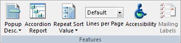 You use the Report Properties group to control report properties. The Report Properties group is shown in the following image.