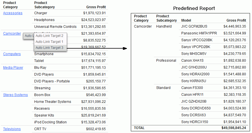 In the following image, the source report on the left shows all Product Categories. Since Auto Linking is enabled in the source, the Product Categories all appear as hyperlinks. The Auto Linking Target property has been set for 3 reports that all have filters for Product Category.