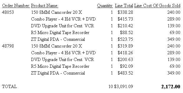SUM QUANTITY LINEPRICE LINE_COGS AS 'Line Cost of, Goods Sold'