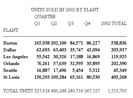 TABLE FILE CENTORD HEADING CENTER "UNITS SOLD IN 2002 BY PLANT" SUM QUANTITY AND ROW-TOTAL AS '2002 TOTAL' ACROSS QUARTER BY PLANTLNG AS 'PLANT' WHERE YEAR EQ 2002 ON TABLE COLUMN-TOTAL AS 'TOTAL UNITS' ON TABLE SET PAGE-NUM OFF ON TABLE SET STYLE * TYPE=REPORT, GRID=OFF,$ END