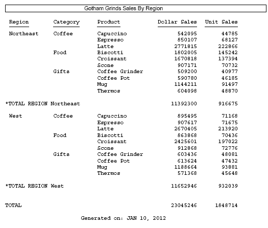 TABLE FILE GGSALES HEADING CENTER "Gotham Grinds Sales By Region" FOOTING CENTER "Generated on: &DATETMDYY" SUM DOLLARS UNITS BY REGION SUBTOTAL BY CATEGORY BY PRODUCT WHERE REGION EQ 'Northeast' OR 'West' ON TABLE PCHOLD FORMAT PDF ON TABLE SET DROPBLNKLINE OFF ON TABLE SET PAGE NOPAGE ON TABLE SET STYLE * SQUEEZE = ON, FONT = ARIAL, TYPE=HEADING, BORDER=LIGHT, $ ENDSTYLE END