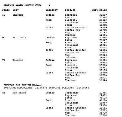 TABLE FILE GGSALES HEADING "PRODUCT SALES REPORT" "" "Page<TABPAGENO" "" SUM UNITS BUDUNITS DOLLARS BUDDOLLARS BY REGION NOPRINT BY ST BY CATEGORY BY PRODUCT ON REGION SUBFOOT " " " SUBFOOT FOR REGION <REGION " " SUBTOTAL BUDDOLLARS: <ST.BUDDOLLARS SUBTOTAL DOLLARS: <ST.DOLLARS " " " ON TABLE SET BYPANEL ON ON TABLE SET PAGE ON ON TABLE PCHOLD FORMAT PDF ON TABLE SET STYLE * TYPE=REPORT, GRID=OFF, $ TYPE = REPORT, HEADPANEL=OFF,$ ENDSTYLE END