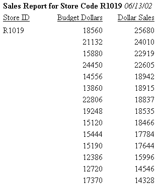 TABLE FILE GGSALES PRINT BUDDOLLARS DOLLARS BY STCD WHERE STCD EQ 'R1019' ON TABLE SUBHEAD "Sales Report for Store Code R1019 <+0>&DATE" ON TABLE SET PAGE-NUM OFF ON TABLE SET ONLINE-FMT HTML ON TABLE SET STYLESHEET * TYPE=REPORT, GRID=OFF,$ TYPE=TABHEADING, FONT='TIMES', SIZE=10, STYLE=BOLD,$ TYPE=TABHEADING, ITEM=2, STYLE=ITALIC,$ ENDSTYLE END