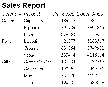 This request uses a StyleSheet to select 12-point Arial bold for the report heading (Sales Report), and 10-point Arial italic for the default column titles (Category, Product, Unit Sales, Dollar Sales), based on the HTML point scale, which differs from standard point sizes. See Formatting Report Data.