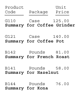 TABLE FILE GGPRODS PRINT PACKAGE_TYPE AND UNIT_PRICE WHERE UNIT_PRICE GT 50 BY PRODUCT_DESCRIPTION NOPRINT BY PRODUCT_ID ON PRODUCT_DESCRIPTION SUBFOOT "Summary for <PRODUCT_DESCRIPTION" ON TABLE SET PAGE-NUM OFF ON TABLE SET ONLINE-FMT PDF ON TABLE SET SQUEEZE ON ON TABLE SET STYLESHEET * TYPE=SUBFOOT, STYLE=BOLD, BOTTOMGAP=.25, $ ENDSTYLE END