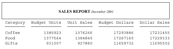 TABLE FILE GGSALES SUM BUDUNITS UNITS BUDDOLLARS DOLLARS BY CATEGORY ON TABLE SUBHEAD "SALES REPORT <+0>December 2001" ON TABLE SET PAGE-NUM OFF ON TABLE SET ONLINE-FMT PDF ON TABLE SET SQUEEZE ON ON TABLE SET STYLESHEET * TYPE = TABHEADING, GRID=ON, JUSTIFY=CENTER, TOPGAP=.25, BOTTOMGAP=.25, $ TYPE = TABHEADING, FONT='TIMES', SIZE=12, STYLE=BOLD, $ TYPE = TABHEADING, ITEM=2, SIZE=10, STYLE=ITALIC, $ ENDSTYLE END