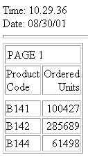 This example generates a report consisting of product codes and quantities, and displays the current time and date found in Dialogue Manager system variables. The following explains how the elements required to display this report are combined. The numbers to the left of the example apply to the notes that follow.