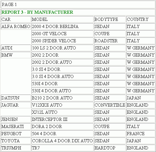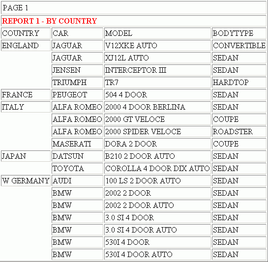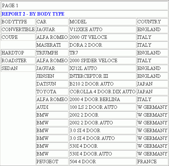 TABLE FILE CAR "REPORT 1 - BY COUNTRY" PRINT CAR MODEL BODYTYPE BY COUNTRY ON TABLE HOLD FORMAT HTMTABLE AS REPORT1 ON TABLE SET STYLE * TYPE=HEADING,STYLE=BOLD,COLOR=RED,$ ENDSTYLE END TABLE FILE CAR "REPORT 2 - BY BODY TYPE" PRINT CAR MODEL COUNTRY BY BODYTYPE ON TABLE HOLD FORMAT HTMTABLE AS REPORT2 ON TABLE SET STYLE * TYPE=HEADING,STYLE=BOLD,COLOR=BLUE,$ ENDSTYLE END TABLE FILE CAR "REPORT 3 - BY MANUFACTURER" PRINT MODEL BODYTYPE COUNTRY BY CAR ON TABLE HOLD FORMAT HTMTABLE AS REPORT3 ON TABLE SET STYLE * TYPE=HEADING,STYLE=BOLD,COLOR=GREEN,$ ENDSTYLE END -HTMLFORM BEGIN !IBI.FIL.REPORT1; !IBI.FIL.REPORT2; !IBI.FIL.REPORT3; -HTMLFORM END