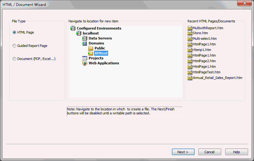Note: If you choose to create a new HTML page or Document using the shortcut menu in the Environments Tree panel, your wizard will not include a Navigator panel since the location of your HTML page or Document is already selected.