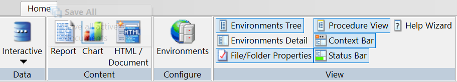 The View Group enables you to control what displays on your screen. For example, you can choose whether to display or hide the Environments Tree or Help Wizard. The View group is shown in the following image.