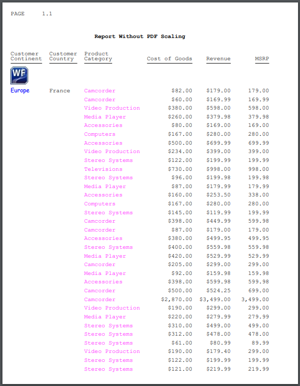 SET SQUEEZE=ON DEFINE FILE WF_RETAIL_LITE SHOWPIC/A100='C:\ibi\WebFOCUS82\samples\web_resource\signin\images\favicon.jpg'; END TABLE FILE WF_RETAIL_LITE PRINT PRODUCT_CATEGORY COGS_US REVENUE_US MSRP_US DISCOUNT_US GROSS_PROFIT_US QUANTITY_SOLD BY SHOWPIC NOPRINT BY CONTINENT_NAME BY COUNTRY_NAME WHERE COUNTRY_NAME EQ 'FRANCE' OR 'ITALY' WHERE RECORDLIMIT=3000; ON TABLE SUBHEAD " " " " " Report Without PDF Scaling " " " " " ON COUNTRY_NAME SUBHEAD " " " " ON TABLE PCHOLD FORMAT PDF ON TABLE SET STYLE * TYPE=DATA, COLUMN=CONTINENT_NAME, FONT=COMIC SANS MS, COLOR=BLUE, STYLE=BOLD+ITALIC, $ TYPE=DATA, COLUMN=PRODUCT_CATEGORY, COLOR=FUSCHIA, $ TYPE=HEADING, STYLE=BOLD, COLOR=RGB(0 35 95), SIZE=12, JUSTIFY=CENTER, $ TYPE=SUBHEAD, SIZE=18, STYLE=BOLD, COLOR=RED, $ TYPE=SUBHEAD, IMAGE=(SHOWPIC), SIZE=(.5 .5), $ TYPE=TABHEADING, SIZE=12, STYLE=BOLD, JUSTIFY=CENTER, $ ENDSTYLE END