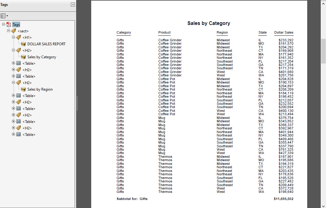 TABLE FILE GGSALES SUM DOLLARS/D12M BY REGION BY CATEGORY ON REGION SUBTOTAL AS 'Total for ' HEADING " " "Sales Report" " " ON TABLE SET ACCESSPDF 508 ON TABLE SET PAGE-NUM OFF ON TABLE COLUMN-TOTAL AS 'Grand Total' ON TABLE SUBHEAD "Regional Totals by Category" ON TABLE PCHOLD FORMAT PDF ON TABLE SET STYLE * TYPE=REPORT, FONT='ARIAL',$ TYPE=TITLE, COLUMN=N1, FONT='ARIAL', STYLE=BOLD,$ TYPE=TITLE, COLUMN=N2, FONT='ARIAL', STYLE=BOLD,$ TYPE=TITLE, COLUMN=N3, FONT='ARIAL', STYLE=BOLD,$ TYPE=HEADING, SIZE=14, STYLE=BOLD,$ TYPE=TABHEADING, SIZE=16, STYLE=BOLD,$ TYPE=SUBTOTAL, BY=1, STYLE=BOLD,$ TYPE=GRANDTOTAL, FONT='ARIAL', STYLE=BOLD,$ ENDSTYLE END