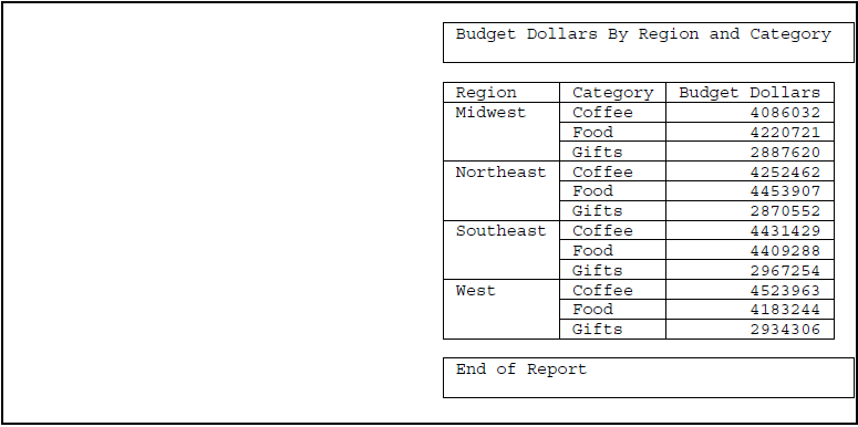 TABLE FILE GGSALES SUM BUDDOLLARS BY REGION BY CATEGORY HEADING "Budget Dollars By Region and Product Category " " " FOOTING "End of Report " " " ON TABLE SET PAGE-NUM NOLEAD ON TABLE PCHOLD FORMAT PDF ON TABLE SET STYLE * SQUEEZE=ON, GRID=ON, $ TYPE=REPORT, JUSTIFYREPORT=LEFT,$ ENDSTYLE END