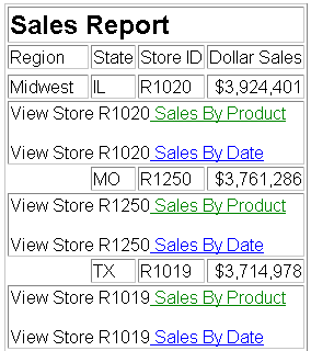 The following report request summarizes product sales and sorts the data by region, state, and store code. The store code also displays in the subfootings where links to detailed reports about the store's sales (by product or by date) display. Each line of the subfoot contains two text objects and one embedded field. The relevant StyleSheet declarations are highlighted in the request.