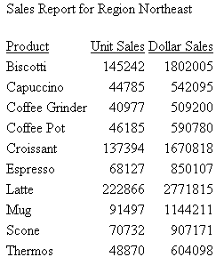 TABLE FILE GGSALES ON TABLE SET PAGE-NUM OFF SUM UNITS AND DOLLARS BY CATEGORY BY REGION HEADING "Regional Sales Report" " " ON TABLE SET STYLE * TYPE=REPORT, GRID=OFF, $ TYPE=DATA, COLUMN=REGION, URL=/ibi_apps/WFServlet?(IBIF_ex='ggdrill' AREA=REGION IBIC_server='EDASERVE' IBI_APPS='IBISAMP'),$ ENDSTYLE END