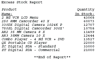 TABLE FILE CENTINV HEADING "Excess Stock Report" SUM QTY_IN_STOCK BY PRODNAME WHERE QTY_IN_STOCK GT 10000 FOOTING CENTER "**End of Report**" ON TABLE SET PAGE-NUM OFF ON TABLE SET STYLE * TYPE=REPORT, GRID=OFF,$ TYPE=REPORT, COLUMN=N1, STYLE=ITALIC,$ ENDSTYLE END