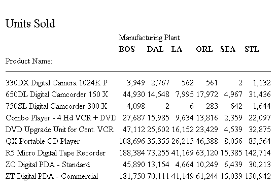 TABLE FILE CENTORD HEADING "Units Sold" SUM QUANTITY BY PRODNAME ACROSS PLANT AS 'Manufacturing Plant' WHERE PRODTYPE EQ 'Digital' ON TABLE SET PAGE-NUM OFF ON TABLE SET STYLE * TYPE=REPORT, GRID=OFF, $ TYPE=HEADING, SIZE=12, $ TYPE=ACROSSVALUE, ACROSS=PLANT, STYLE=BOLD, $ ENDSTYLE END
