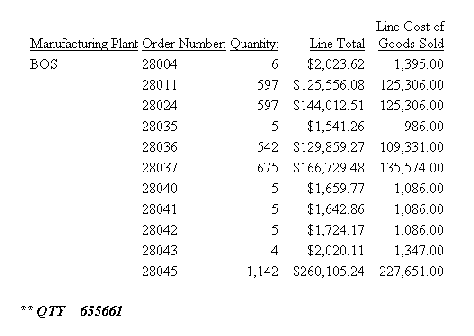 TABLE FILE CENTORD SUM QUANTITY LINEPRICE LINE_COGS AS 'Line Cost of, Goods Sold' BY PLANT BY ORDER_NUM ON PLANT RECAP QTY/F6=QUANTITY; WHERE PLANT EQ 'BOS' WHERE ORDER_NUM LT '56098' ON TABLE SET PAGE-NUM OFF ON TABLE SET STYLE * TYPE=REPORT, GRID=OFF, $ TYPE=RECAP, STYLE=BOLD+ITALIC, $ ENDSTYLE END