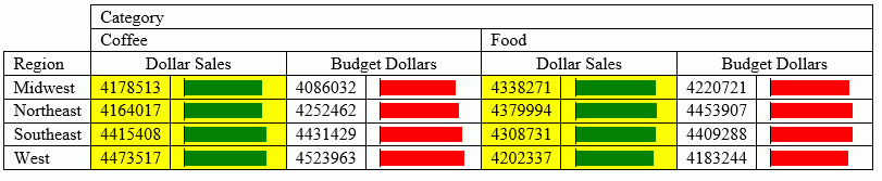 SET VISBARORIENT=H TABLE FILE GGSALES SUM DOLLARS BUDDOLLARS BY REGION ACROSS CATEGORY WHERE CATEGORY EQ 'Coffee' OR 'Food' ON TABLE SET PAGE NOLEAD ON TABLE SET STYLE * TYPE =REPORT ,BORDER=light,$ GRAPHTYPE=DATA, ACROSSCOLUMN=DOLLARS, GRAPHCOLOR=GREEN,BACKCOLOR=RGB(#ffff00), $ GRAPHTYPE=DATA, ACROSSCOLUMN=BUDDOLLARS, GRAPHCOLOR=RGB(255 0 0), $ ENDSTYLE END