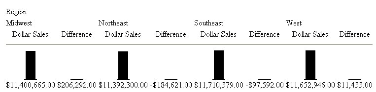 Since the GRAPHSCALE attribute is not specified, the default setting UNIFORM is applied to the report. This setting uses the entire set of values (values from Dollar Sales and Difference) to plot the bar graphs for both columns.