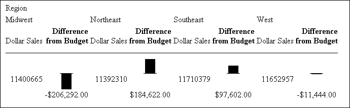DEFINE FILE GGSALES Difference/D12.2M=DOLLARS-BUDDOLLARS; END TABLE FILE GGSALES SUM DOLLARS/D12.2M Difference ACROSS REGION ON TABLE SET STYLE * GRAPHTYPE=DATA, ACROSSCOLUMN=N1,$ GRAPHTYPE=DATA, ACROSSCOLUMN=N2,$ TYPE=REPORT, GRAPHSCALE=DISTINCT,$ ENDSTYLE END