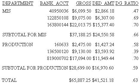 TABLE FILE EMPLOYEE SUM GROSS DED_AMT AND COMPUTE DG_RATIO/F4.2 = DED_AMT / GROSS; BY DEPARTMENT BY BANK_ACCT WHERE BANK_ACCT NE 0 ON DEPARTMENT SUMMARIZE AS 'SUBTOTAL FOR ' ON TABLE SET PAGE-NUM OFF ON TABLE SET ONLINE-FMT HTML ON TABLE SET STYLESHEET * TYPE=REPORT, GRID=OFF, $ ENDSTYLE END
