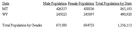 TABLE FILE GGDEMOG PRINT MALEPOP98 FEMPOP98 ROW-TOTAL/D12 AS 'Total Population by State' BY ST WHERE (ST EQ 'WY' OR 'MT') ON TABLE COLUMN-TOTAL AS 'Total Population by Gender' ON TABLE SET PAGE-NUM OFF ON TABLE SET ONLINE-FMT HTML ON TABLE SET STYLESHEET * TYPE=REPORT, GRID=OFF, $ ENDSTYLE END