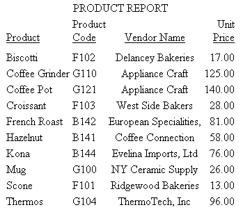 TABLE FILE GGPRODS SUM UNITS BY PRODUCT_DESCRIPTION BY PRODUCT_ID BY VENDOR_NAME ON TABLE SUBHEAD "PRODUCT REPORT" ON TABLE SET PAGE-NUM OFF ON TABLE SET ONLINE-FMT HTML ON TABLE SET STYLESHEET * TYPE = REPORT, GRID=OFF, $ TYPE = REPORT, COLUMN = VENDOR_NAME, JUSTIFY = CENTER, $ TYPE = TABHEADING, JUSTIFY = CENTER, $ ENDSTYLE END