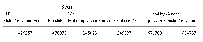 This request centers the column title, State, created by the ACROSS phrase over the two values (MT and WY) and the row total column title, Total by Gender, over the two row totals (Male Population and Female Population). Notice that each across value functions as a title for one or more columns in the report.