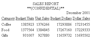 TABLE FILE GGSALES SUM BUDUNITS UNITS BUDDOLLARS DOLLARS BY CATEGORY ON TABLE SUBHEAD "SALES REPORT" "**(CONFIDENTIAL)**" "December 2001" ON TABLE SET PAGE-NUM OFF ON TABLE SET ONLINE-FMT HTML ON TABLE SET STYLESHEET * TYPE = REPORT, GRID=OFF, $ TYPE = TABHEADING, LINE = 1, JUSTIFY = CENTER, $ TYPE = TABHEADING, LINE = 2, JUSTIFY = CENTER, $ TYPE = TABHEADING, LINE = 3, JUSTIFY = RIGHT, $ ENDSTYLE END