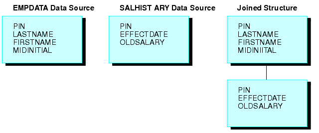The following example illustrates a unique joined structure. Two FOCUS data sources are joined together: an EMPDATA data source and a SALHIST data source. Both data sources are organized by PIN, and they are joined on a PIN field in the root segments of both files. Each PIN has one segment instance in the EMPDATA data source, and one instance in the SALHIST data source. To join these two data sources, issue this JOIN command: