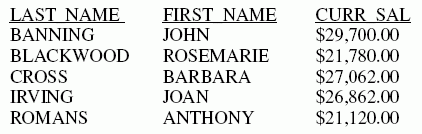 LAST_NAME FIRST_NAME GROSS DATE_ATTEND COURSE_NAME --------- ---------- ----- ----------- ----------- JONES DIANE $1,540.00 82/05/26 BASIC REPORT PREP FOR PROG SMITH MARY $1,100.00 81/11/16 BASIC REPORT PREP FOR PROG